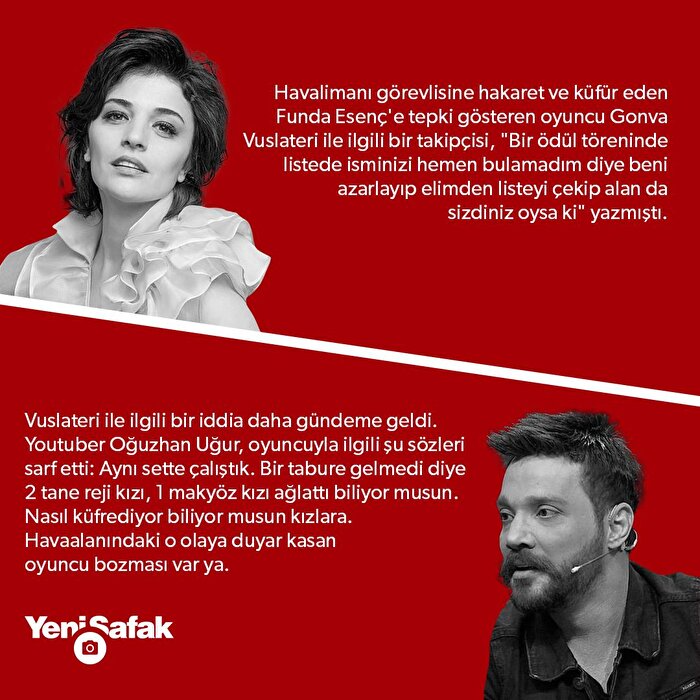 Gonca Vuslaterinin bir film setinde tabure getirmediği için çalışanlara hakaret ettiğini ve ağlattığını söyleyen Uğur Vuslateri için Oyuncu. YouTuber Oğuzhan Uğur havalimanında hakarete maruz kalan kadın çalışana destek verirken bir çalışana kötü davrandığı ortaya çıkan Gonca Vuslateri için Oyuncu bozuntusu diyerek. Gucci mankeni ile ilgili soruya s.